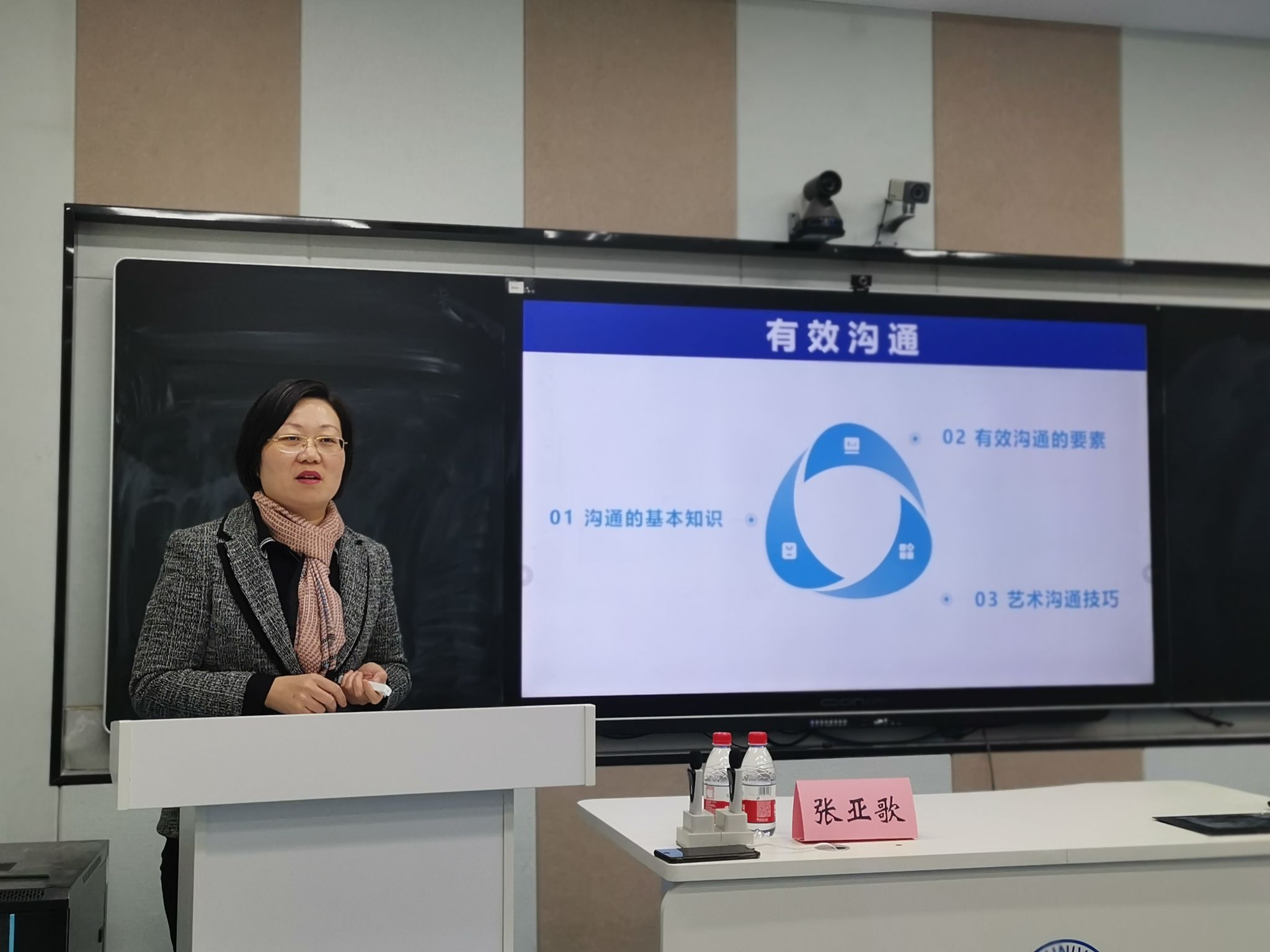 张亚歌围绕沟通的基本知识、有效沟通的要素和艺术沟通的技巧三方面全面介绍了沟通的重要性,她说到沟通是研究生应具备的基本能力,是为了一个设定的目标,把信息、思想和感情在个人或群体间传递,从而达成共识的过程,并从四个方面重点讲述沟通的作用,即说明事物、获取信息、交流感情和统一思想。张部长结合日常工作、学习、生活经历,列举身边实例,形象生动阐释了如何与同事、同学、家人、朋友进行高质量沟通,最后向同学们讲述了沟通艺术之妙,介绍了除语言沟通之外的其他方式方法。