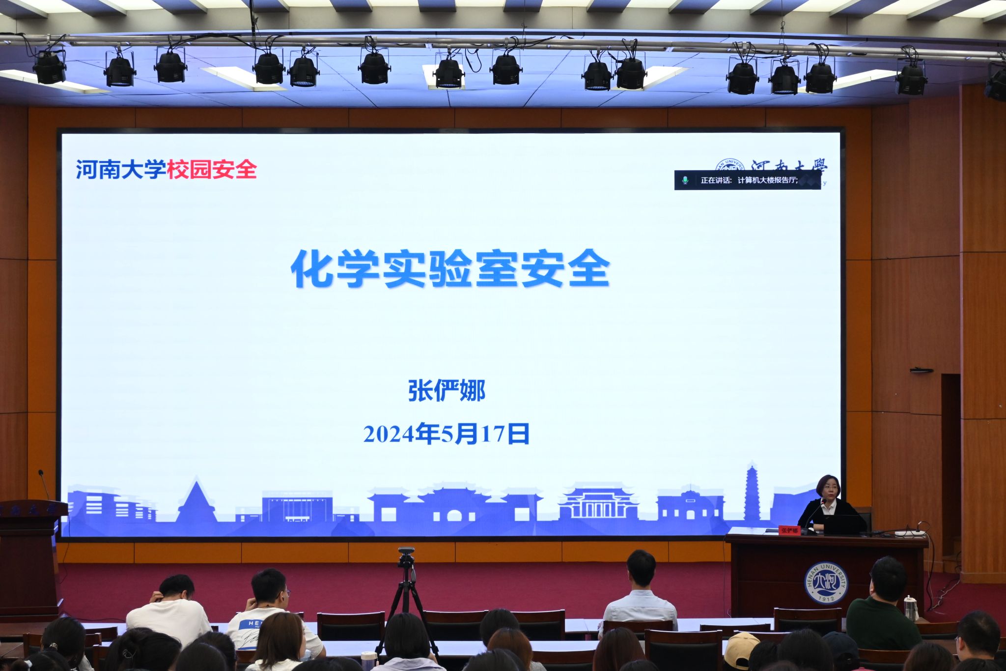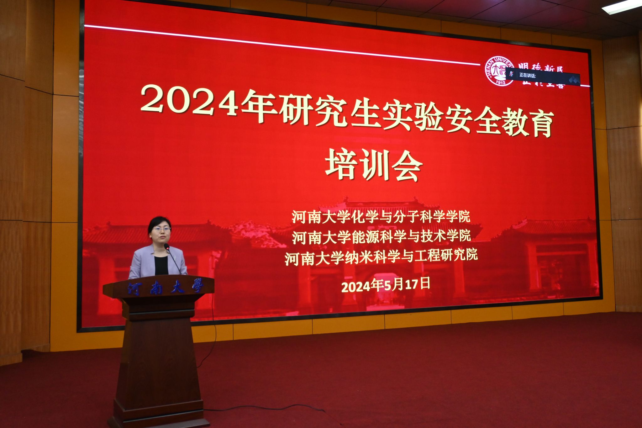 党委书记程亚敏主持。化学与分子科学学院党委书记常凤香首先就本次研究生实验安全教育培训工作的意义、培训内容和考核要求做了部署,指出了实验室仍然存在管理不规范、不按流程操作等违反实验室安全管理的行为,分析了这些违规行为存在的安全隐患,要求同学们必须提高安全意识、树牢安全理念、严守规章制度、严格操作规范。强调今后进入实验室必须人人持证。