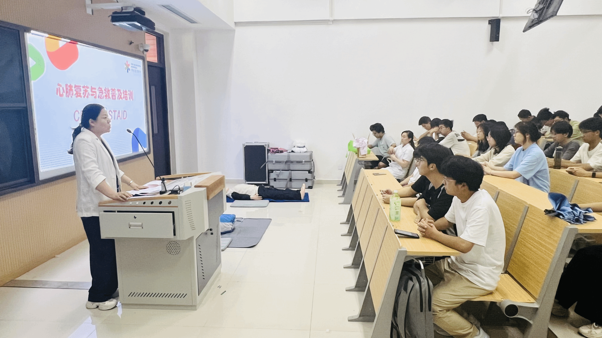 邀请校医院4名专业医护人员面向全体2024级本科生开展心肺复苏(CPR)及应急知识普及培训。